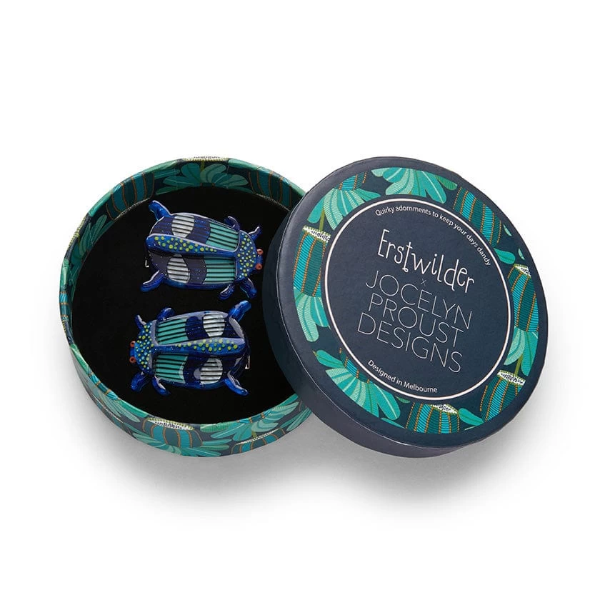 Hand-assembled from a selection of coloured textured resins and featuring a combination of printing, painting and highly detailed line work, this set of two Beetle hair clips is part of the second Erstwilder x Jocelyn Proust collaboration. Have fun matching all your accessories by pairing them with the Beetle brooch and ring.