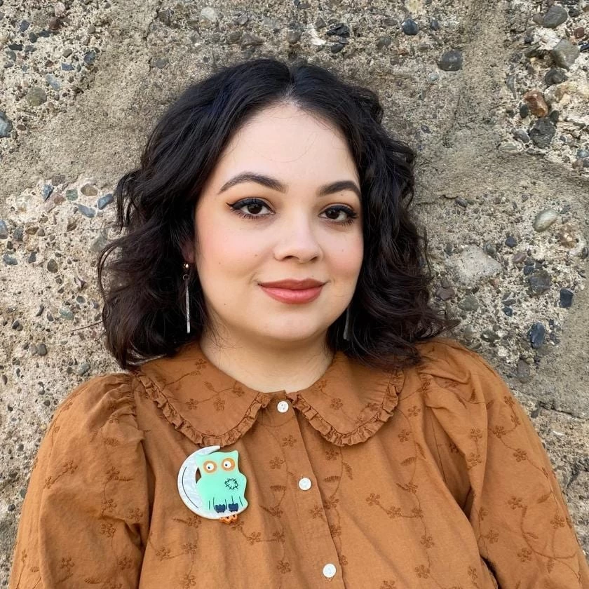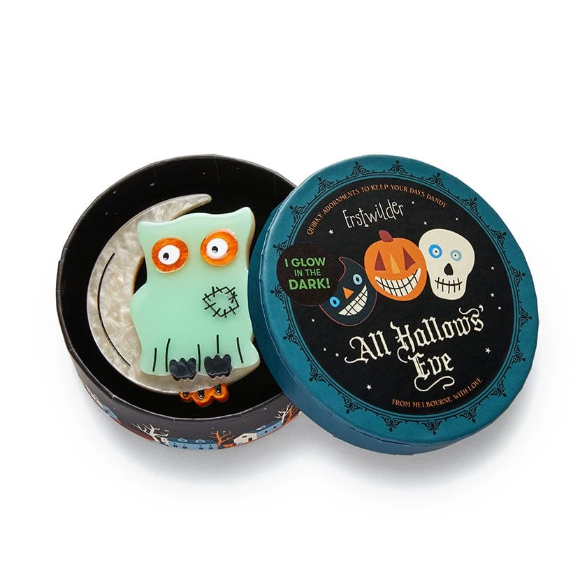 BOO! HOOT! This haunting A Mostly Ghostly Owl brooch has been hand-assembled from glow-in-the-dark, solid and textured resins and features a combination of hand-painted and laser-etched details. A part of our All Hallows’ Eve release, this design is a throwback to the homemade Halloween primitive characters crafted around the turn of the 21st century, and purposely references the patchwork and hand-stitched style that was popular at the time.
