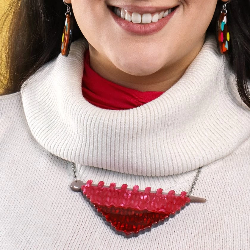 Crafternoons just got a whole lot cosier with this delightful knitting needle and yarn necklace. Hand-crafted from colourful resins and featuring hand-painting and printed detailing, this productive pastime has a matching brooch and is also available as a hard enamel pin.