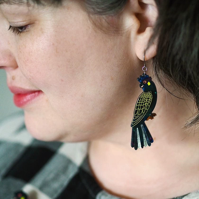 Hand-assembled from a selection of coloured textured resins and featuring a combination of printing, painting and highly detailed line work, these Black Cockatoo earrings are part of the second Erstwilder x Jocelyn Proust Designs collaboration. Bella pairs perfectly with its matching brooch too.