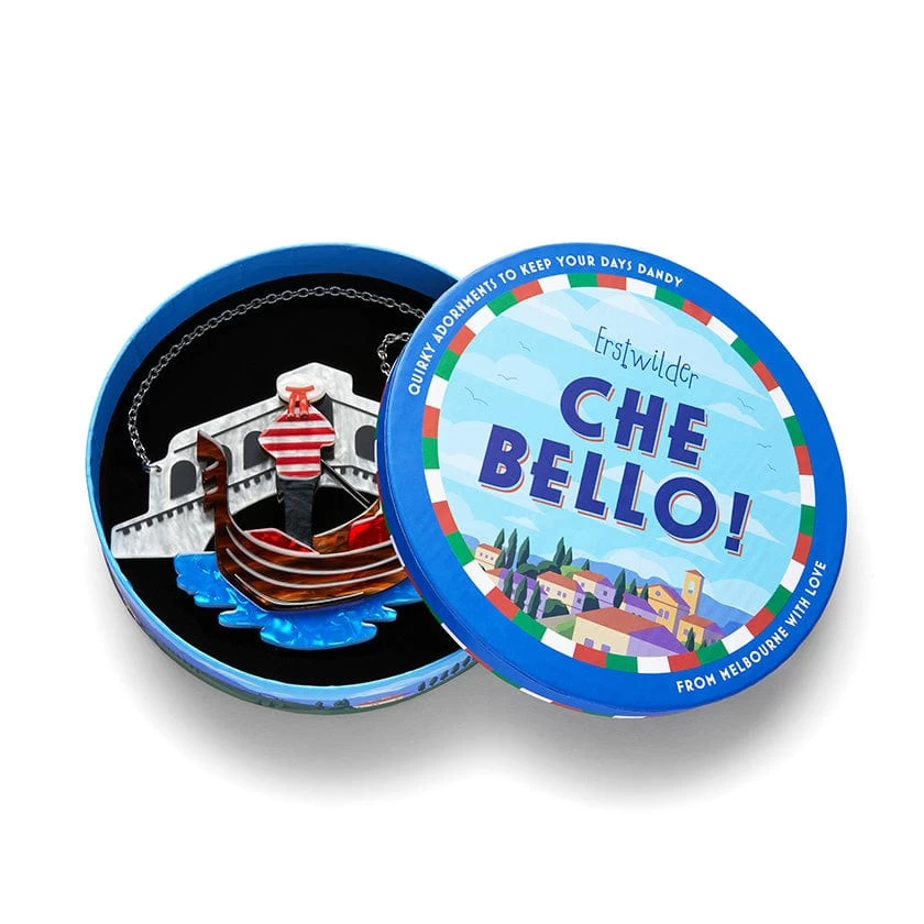 Celebrating the history, culture, fauna, and culinary delights of Italy, the Canals of Venice necklace has been created as part of the Che Bello! (How Beautiful!) collection. Hand-assembled from textured resins and complete with hand-etched, painted and printed detailing, this design highlights all the magical romance of Italy. Complete the look with the matching brooch!