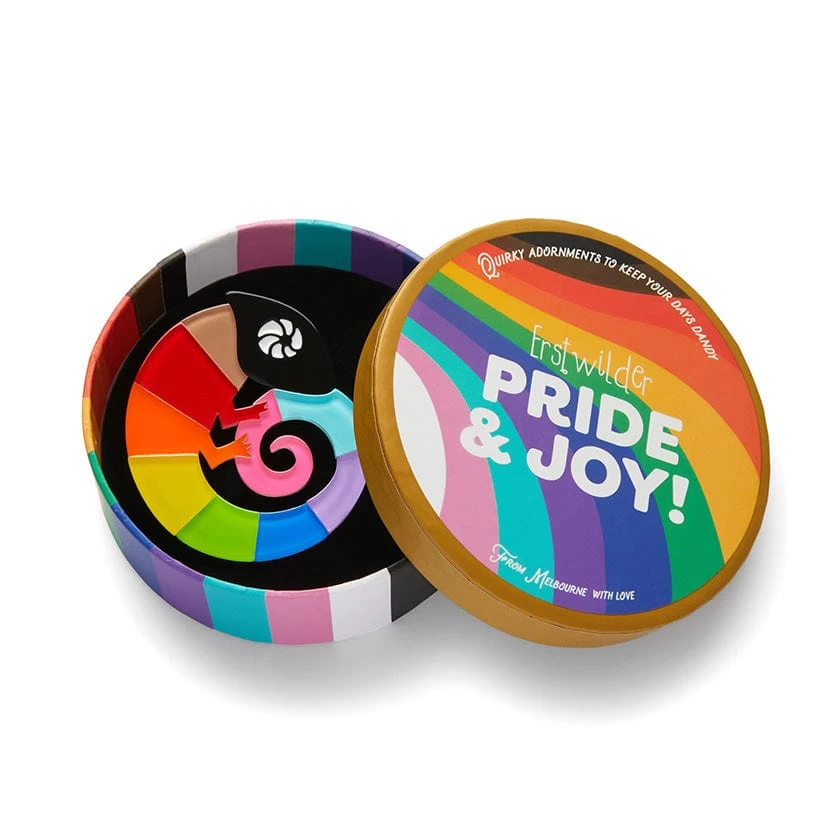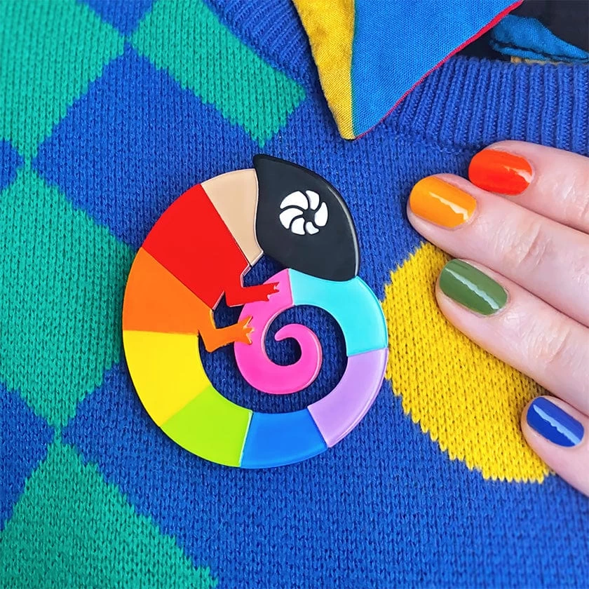 This chameleon says why blend in when you’re perfect just the way you are! Hand-assembled from vibrant bubble resins, and with hand-painted detailing, the Carmel’s Colourful Chameleon brooch design has had a makeover inspired by all the colours of the progress pride rainbow, for a fun and playful look you can be proud of. Love this design? You’ll also find it available as an enamel pin, while stocks last.