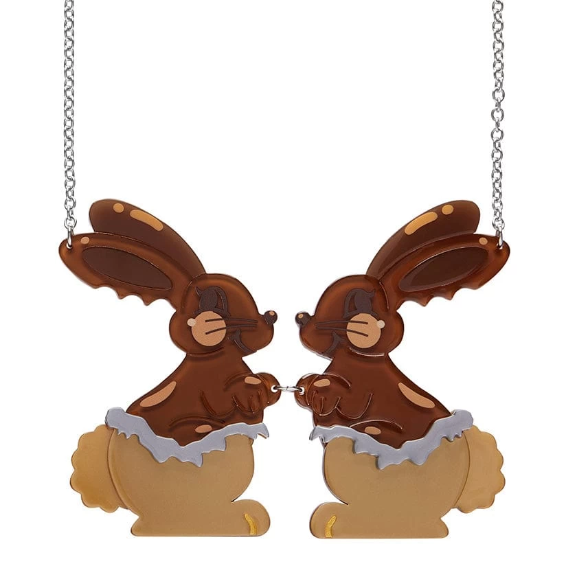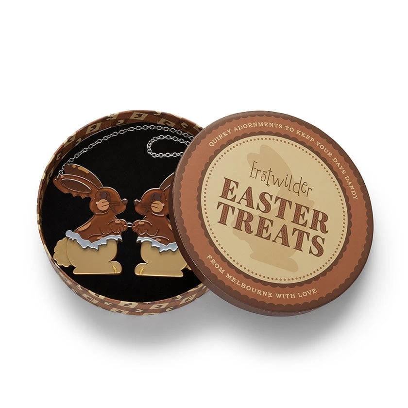 Meet Coco (and Coco), the sweetest little hoppers in town! Half-wrapped in shiny foil, these resin chocolate bunnies are just waiting to be devoured (with your eyes, of course). Whether you’re an ears-first snacker or a savour-every-bite kind of person, this delightfully layered resin, limited-run, Easter-inspired necklace is here to bring the joy – no melting and no mess, just timeless, chocolatey charm. Also available as a brooch, earrings, and enamel pin, while stocks last.