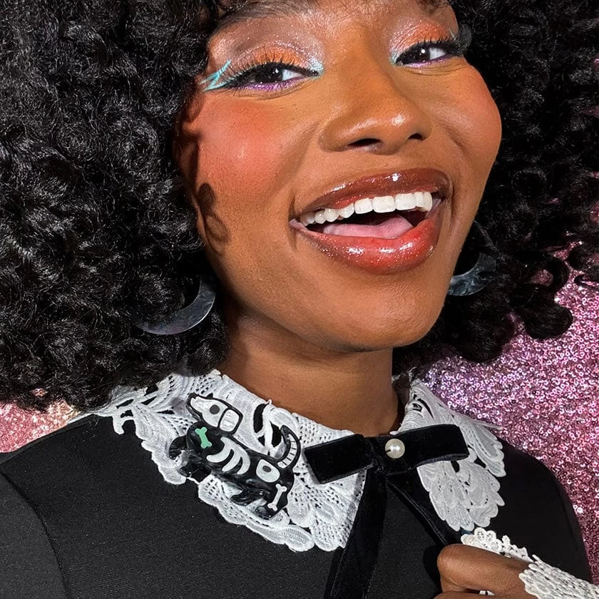 One of the many frightful familiars that comprise our affectionately titled ‘Bone Brigade’, this Doggo Darkness brooch has been hand-assembled from textured and glow in the dark resins, and brought to spooky life through a combination of hand-painted, printed and laser-etched details. A good boy, regardless of his lifeforce status, this perilous pup really just wants to play.