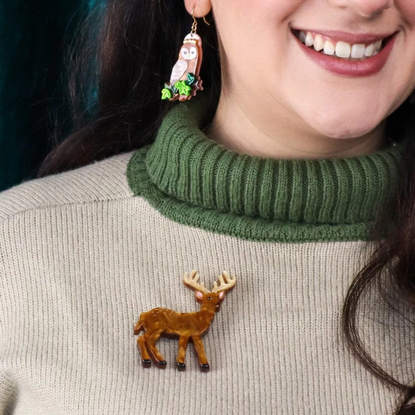 Effortless elegance abounds with this Enchanted Deer brooch, hand-assembled from a combination of magnificent resins and brought to life through laser etching and printed detailing. Part of our joy-sparking Fleur Harris Woodlands release, this dignified design is perfect for devoted dreamers.