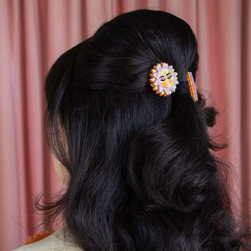 Fall in love with these radiating Eternal Sunshine hair clips. These wearable art accessories have been hand-assembled from a selection of stand-out resins. Part of our Spellbound release, these sun hair clips feature a combination of hand-painted and laser-etched details making them a shining Halloween wardrobe supplement.