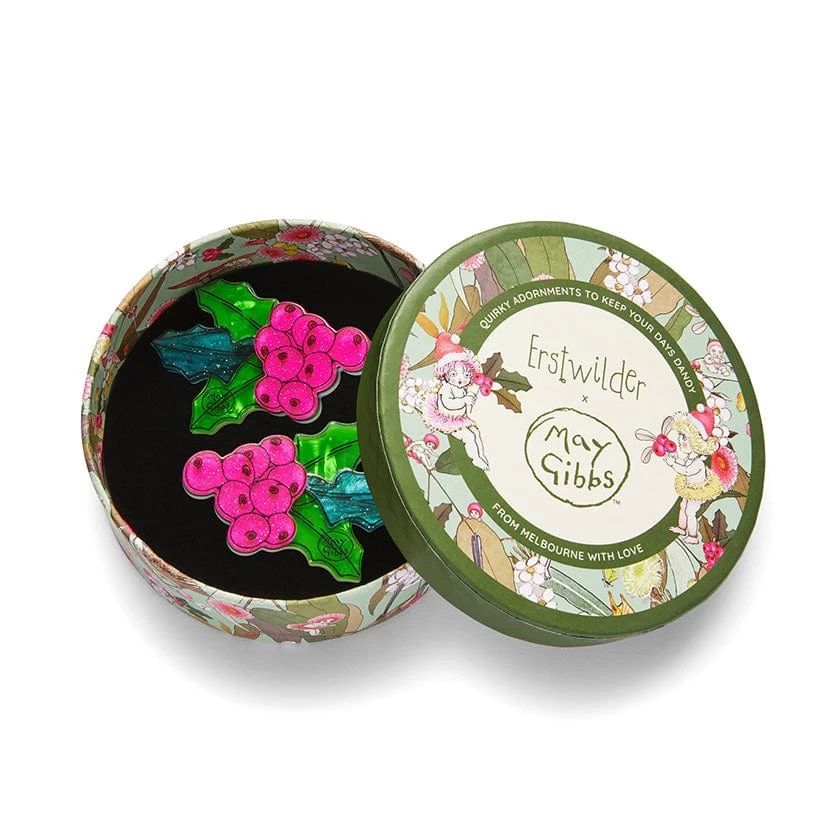 Part of our 2023 Erstwilder x May Gibbs collection, these Festive Foliage hair clips have been caringly constructed from layered resins and finished with a combination of printing and highly detailed line work. Born from the imagination of one of Australia’s most-beloved artists, these holly hair accessories keep their Christmas colours all year round.