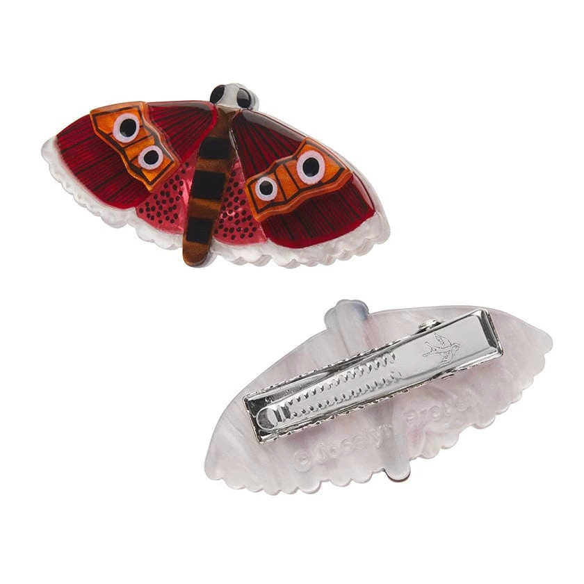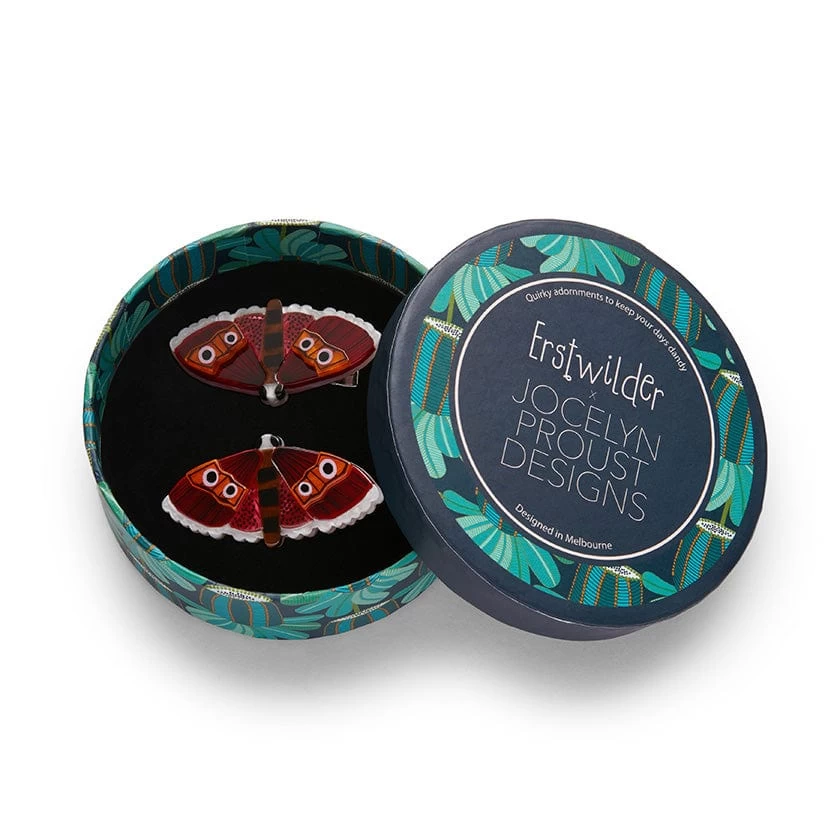 Hand-assembled from a selection of coloured textured resins and featuring a combination of printing, painting and highly detailed line work, this set of two Bogong Moth hair clips is part of the second Erstwilder x Jocelyn Proust collaboration. Match all your accessories by pairing them with the Bogong Moth brooch, necklace or hair clips.