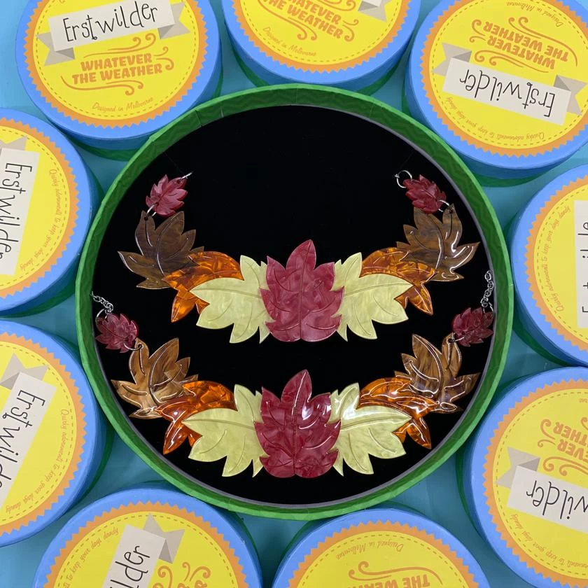 Autumn is the time of crunchy leaves and orange trees! With a combination of beautiful textured resins in the perfect autumnal pallet, featuring hand-assembled details adorn yourself with the spirit of autumn. Our Foliage Follies necklace is sure to LEAF you smiling!Â
