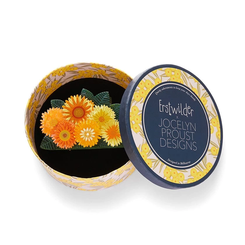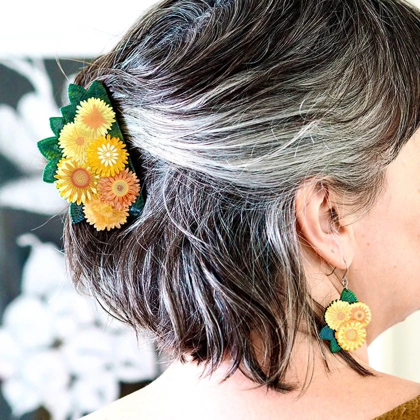 Hand-assembled from a selection of vibrant resins and featuring a combination of printed and painted details, this Daisy-inspired hair clip claw is part of the third Erstwilder x Jocelyn Proust Designs collaboration. With good vibes positively radiating from its core, the joy can be multiplied when Forever and Ever is paired with its matching brooch or any of our complementary earring designs.