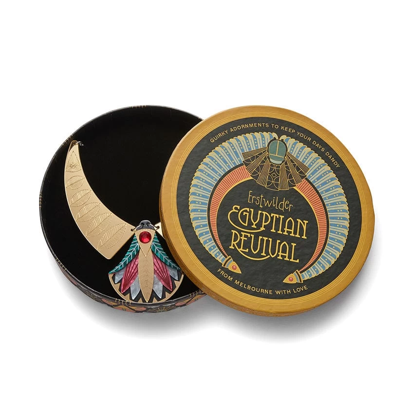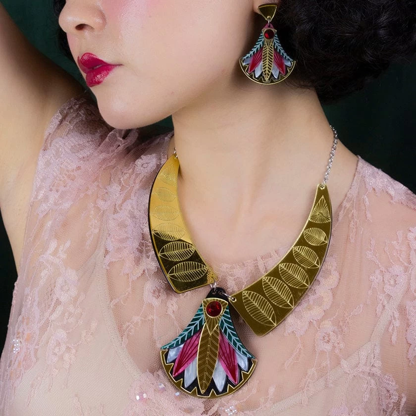 Precursor to paper, most versatile of materials, this Gift of the Nile Papyrus necklace is part of our Egyptian Revival collection. Inspired by all things Ancient Egypt, as filtered through the lens of Art Deco design, this statement necklace is brought to life with a sublime selection of textured resins with hand-painted detail and features a gorgeous gold mirror resin specifically chosen for this release as well as a beautiful Czech glass gemstone at its heart. It can be worn together with its matching brooch and drop earrings, makes a suitable companion piece for our Gift of the Nile Papyrus mirror compact, and pairs perfectly with our Garden of Blessings brooch.
