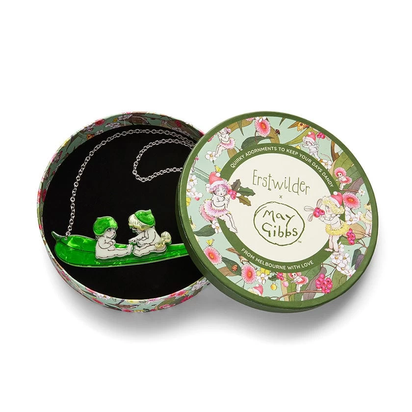 Part of our 2023 Erstwilder x May Gibbs collection, this Gumnut Twins necklace has been caringly constructed from layered resins and finished with a combination of printing and highly detailed line work. Born from the imagination of one of Australia’s most-beloved artists, Snugglepot and Cuddlepie love to spread joy and laugh together.