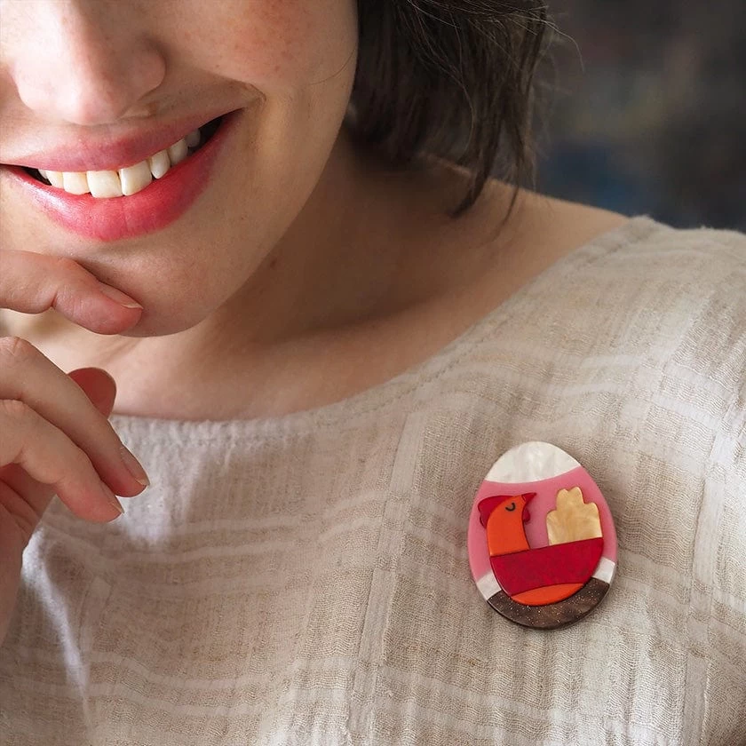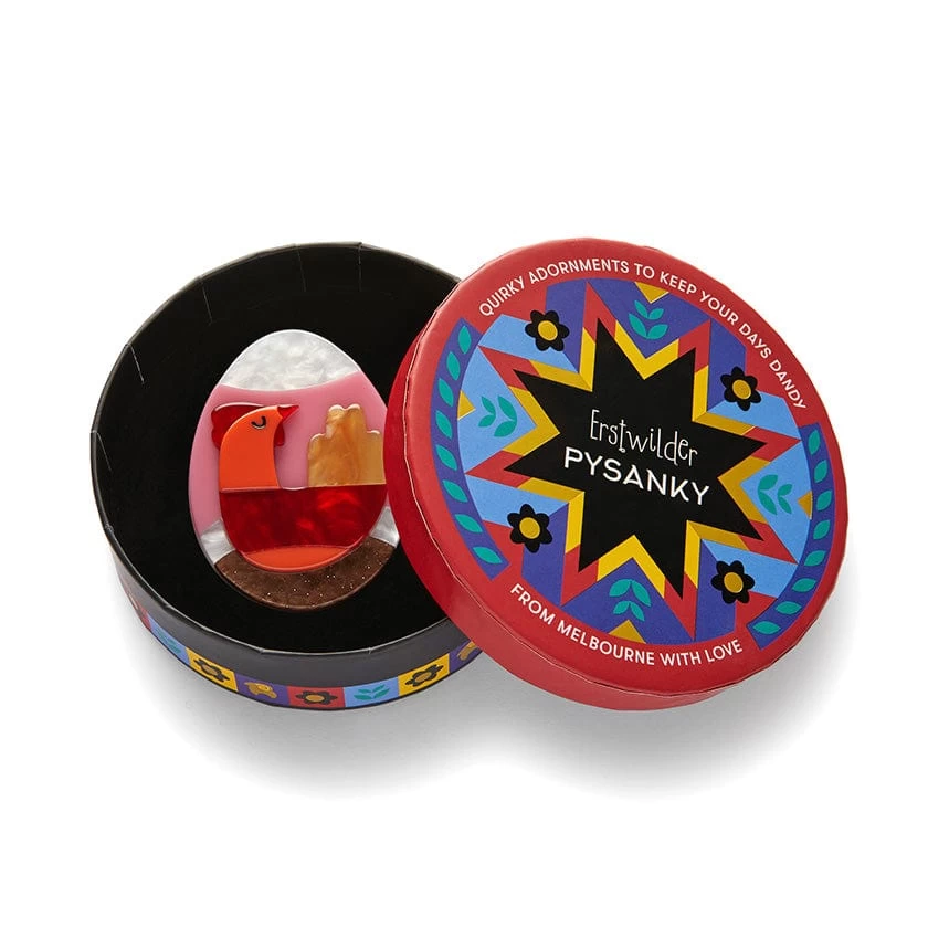 A Pysanka representing fertility for whomever bears it, this Hen of Fertility brooch has been hand-assembled and hand-painted, utlising the colours red, brown and green to signify love and joy, the earth and new life, respectively. This egg is an appropriate gift for yourself or anyone hoping for children in their near future.