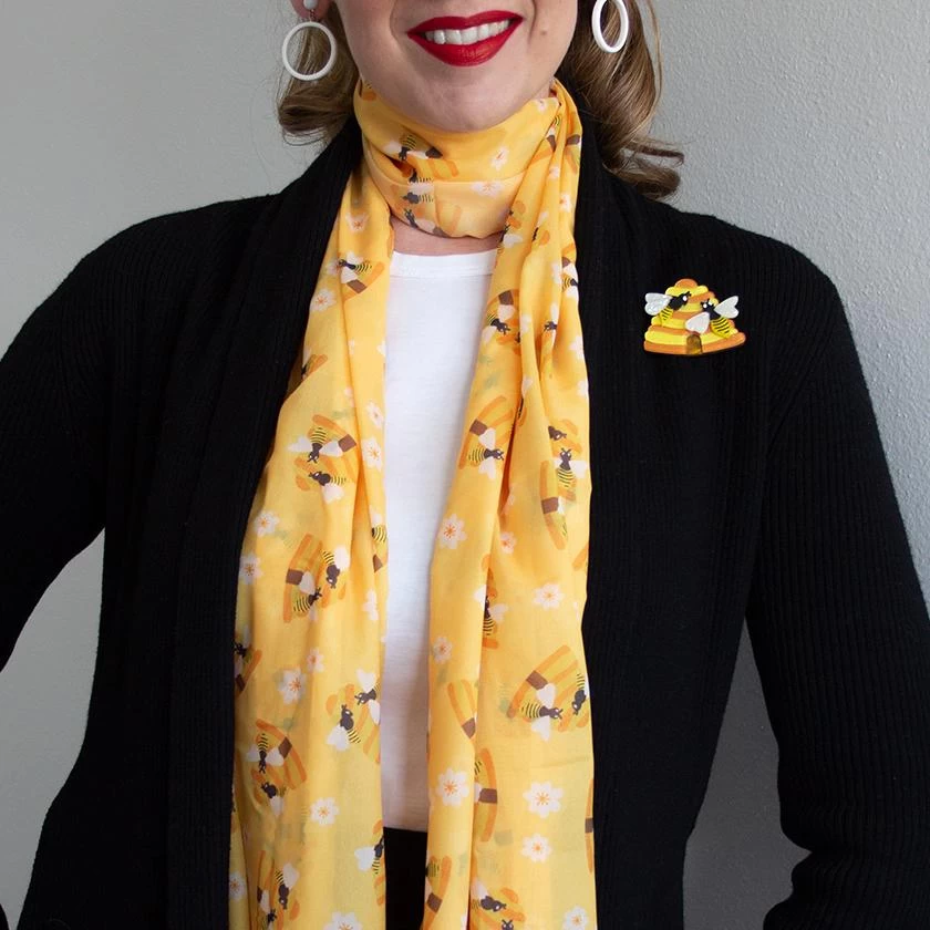 Get things buzzing in this lightweight neck scarf featuring a repeat pattern of our Honey I’m Home design. Made from 100% Polyester, with a velvet chiffon feel, you’ll be bright as a bee in this one.