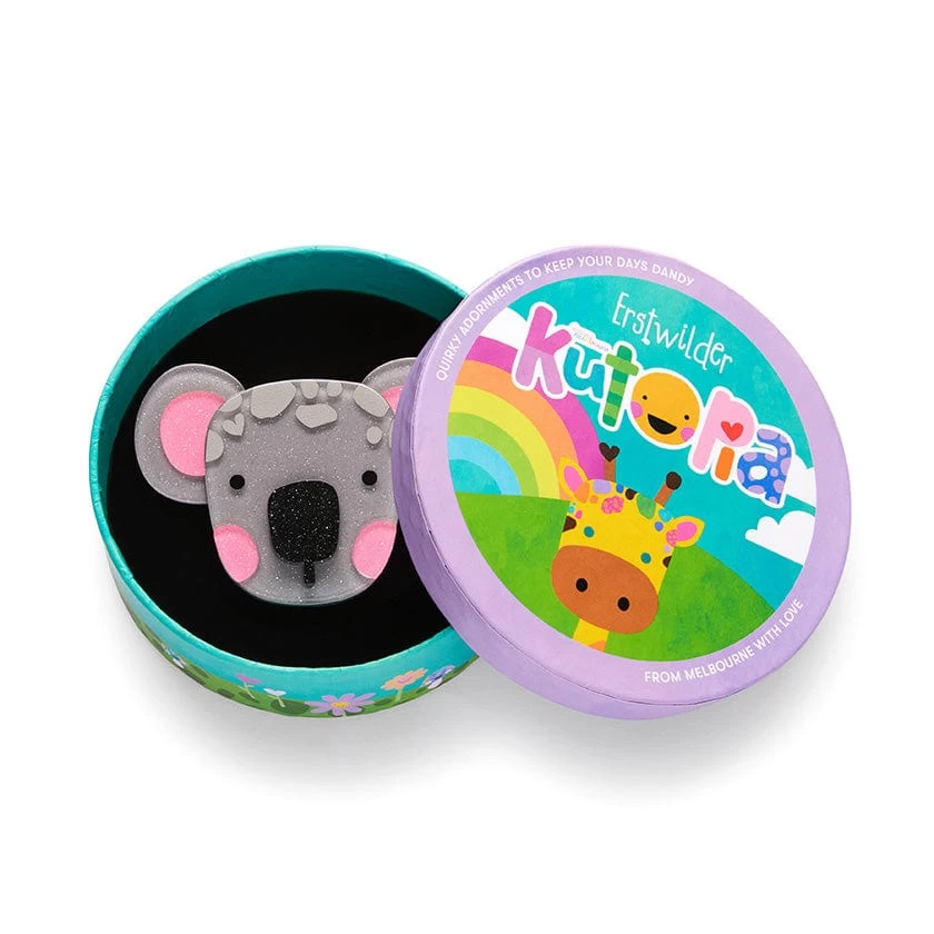 This Erstwilder x Kasey Rainbow Keith the Koala brooch has been hand-assembled from a combination of colourful resins and finished with hand-painted details. A resident of the wonderful world of Kutopia, Keith is the kind to keep you company whenever you need it. Wear him with his matching earrings or hairclips, or when carrying around his complementary compact, to complete the ensemble.