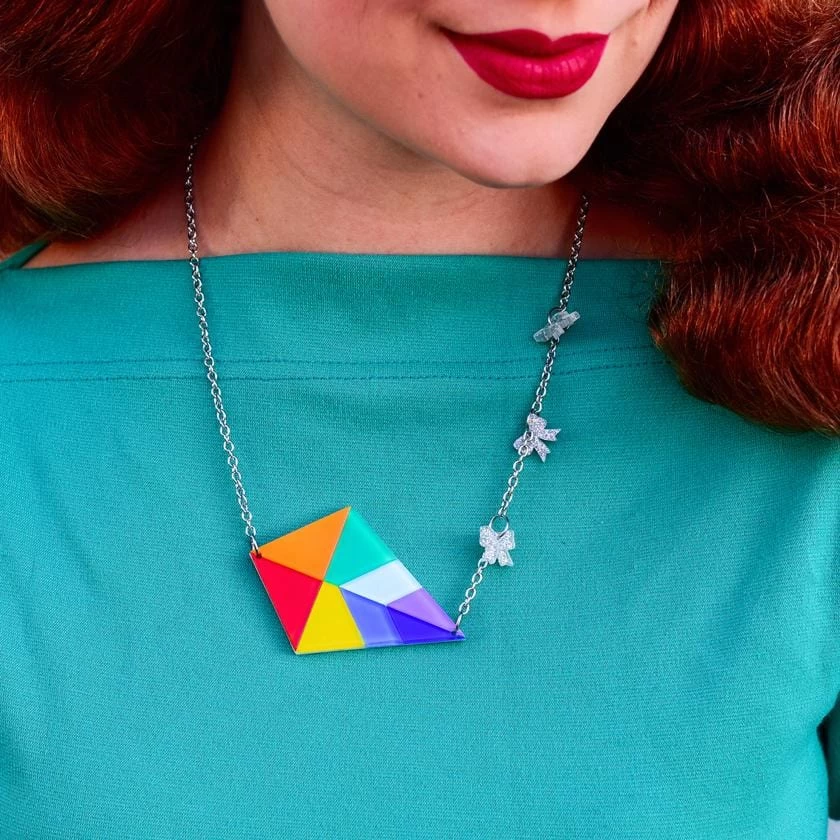 There’s something so wholesome about a kite flying in the daytime. Our hand-assembled necklace features bright and bold bubble resins and gorgeous glitter ribbons to flap in the breeze and adorn your neck! So we’ll hold the kite, and you run and we can play in the sun together!Â