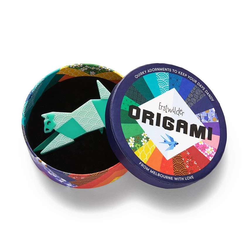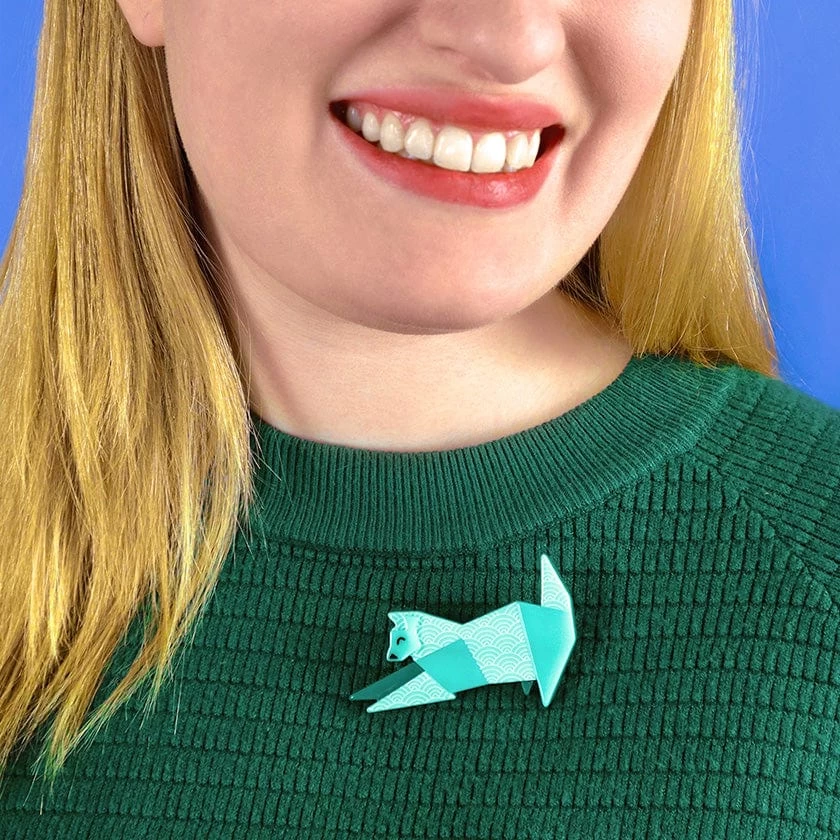 Hand-assembled from a carefully chosen mix of printed and solid resins, this limited-run Kitty Cat, Kitty Cat brooch will have you feeling like the cat’s meow. With the expertly-layered resin perfectly emulating the folds of origami paper, you can play your own game of cat and mouse by pairing this piece with the This Little Mouse brooch, or become a copycat with its matching enamel pin.