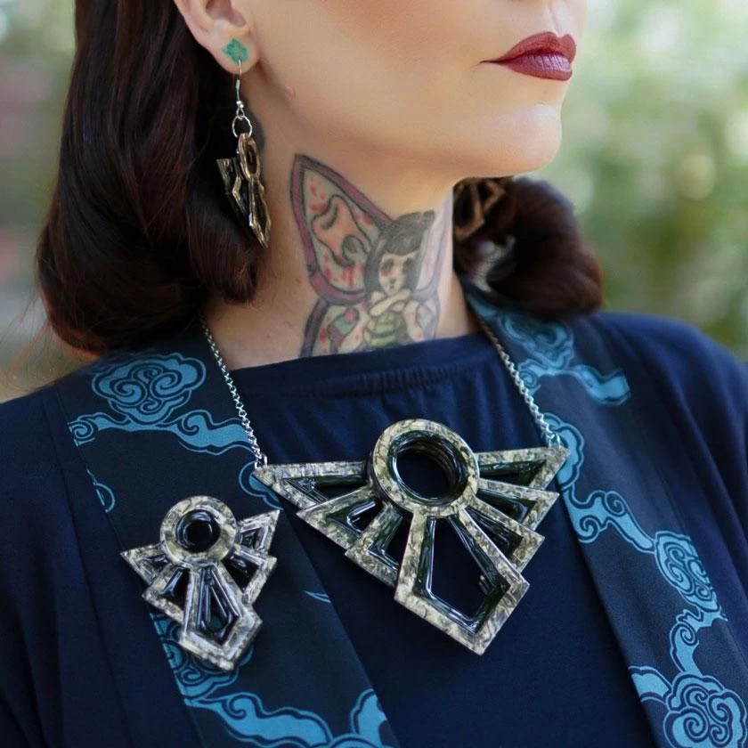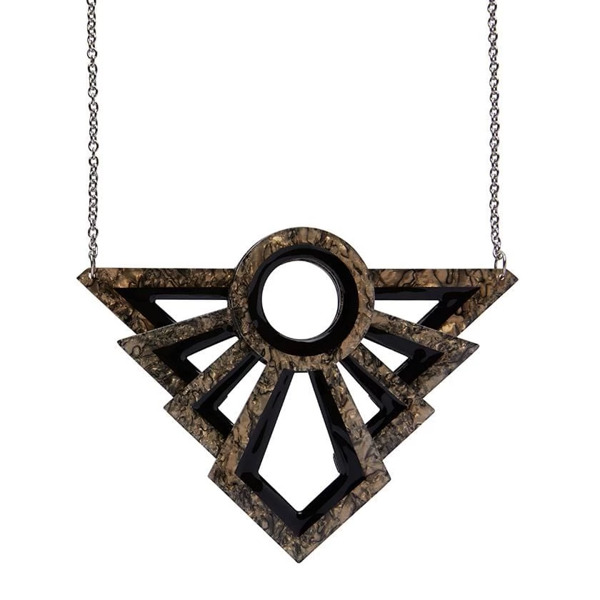 Make a statement for the ages with this elegant Art Deco necklace. Hand assembled from some of our finest textured resins and featuring hand-painted details, this one will have you turning heads even in the most exclusive company.
