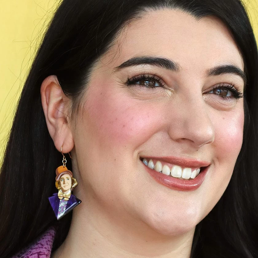 The sweet world of Willy Wonka comes to life with these limited-run, hand-assembled ‘Mr Wonka’ drop earrings. Created as part of the officially licensed Willy Wonka and the Chocolate Factory x Erstwilder collection and inspired by the timeless 1971 film, these wearable art accessories have been produced from layered resin and completed with etched, painted and printed detailing, perfectly capturing the classic pose and expression of Gene Wilder as Willy Wonker. Love it? Find it available also as resin earrings and an enamel pin, while stocks last.