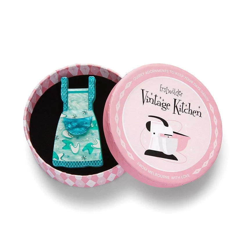 Step back into the heart of the home with this nostalgia-inducing teal apron brooch, part of the second Vintage Kitchen release. Hand-assembled from resin and finished with a combination of printing and epoxy, this retro-future No Strings Attached design is also available in a pretty pink colourway.
