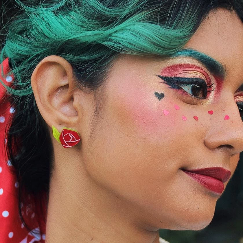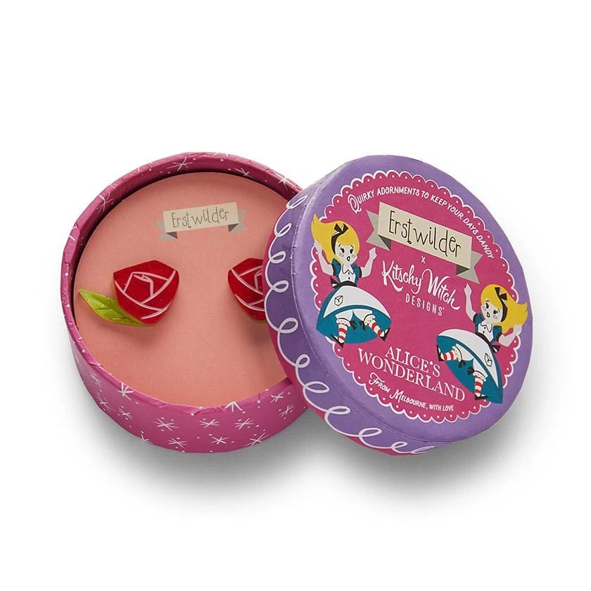 Part of our Alice’s Wonderland collaboration with Kitschy Witch, these hand-assembled red rose earrings use a radiant combination of green and red resins and feature hand-painted details. Pair them with the matching brooch, the matching mini or any of the other wonderful pieces from the collection.