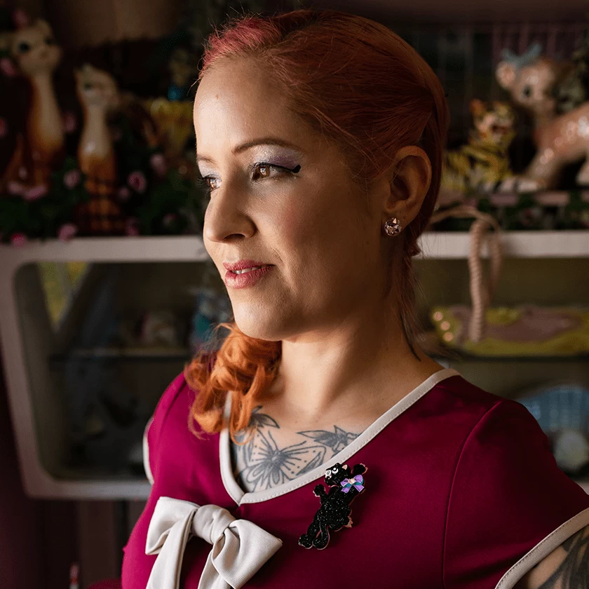 Don’t let the bow fool you, she’s still wild! With beautiful glitter resin and hand-assembled details this is one pretty kitty. Indulge your wild side with Erstwilder X Mimsy!