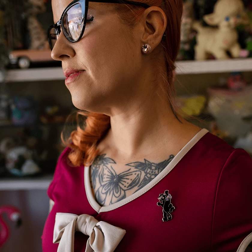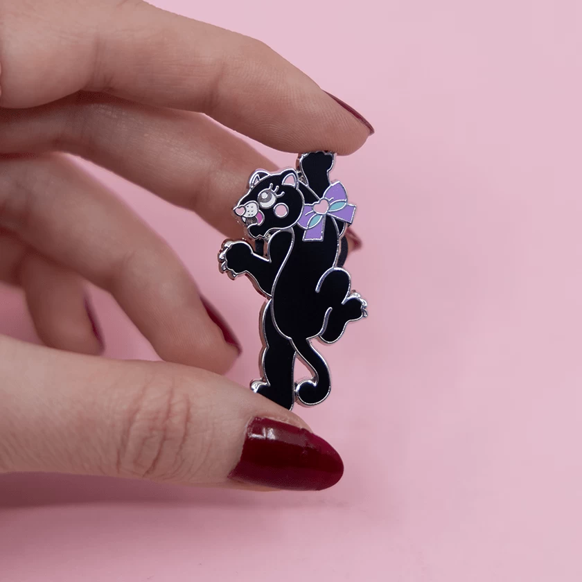 Hold me closer, tiny panther. This hard enamel pin version of our Erstwilder x Mimsy black panther design wil add a little ferocity to your outfit.