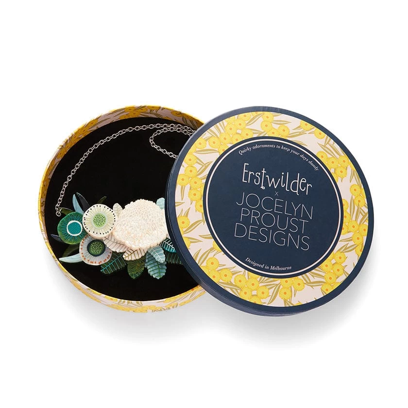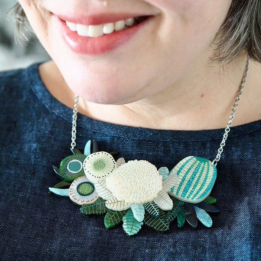 Hand-assembled from a selection of colourful resins and featuring a combination of printed and painted details, this green floral necklace is part of the third Erstwilder x Jocelyn Proust Designs collaboration. Adding a statement to your next ensemble, Pastoral Party can be worn alongside any of the matching brooch designs from which it draws its inspiration, or with any of our complementary earrings.