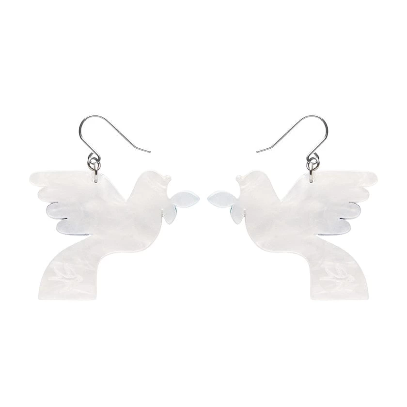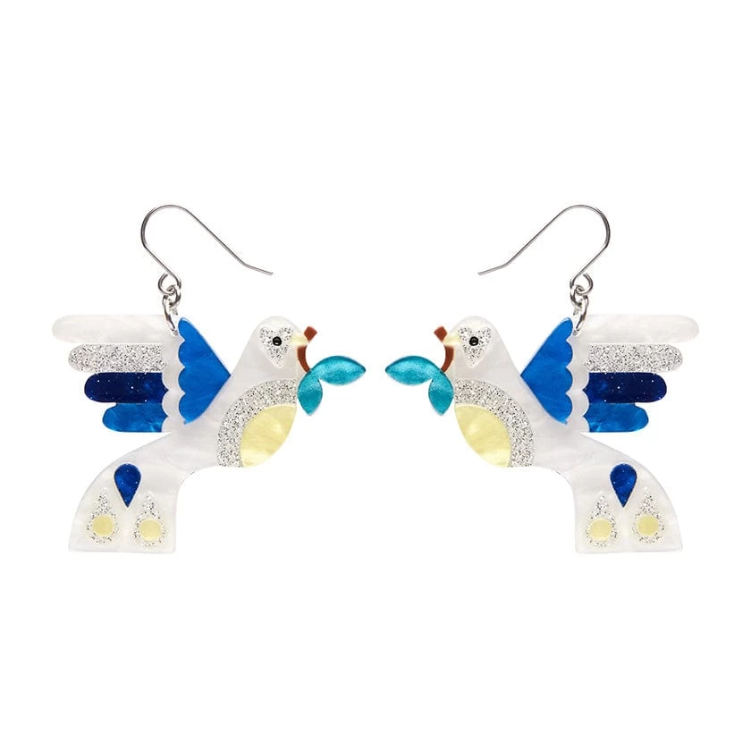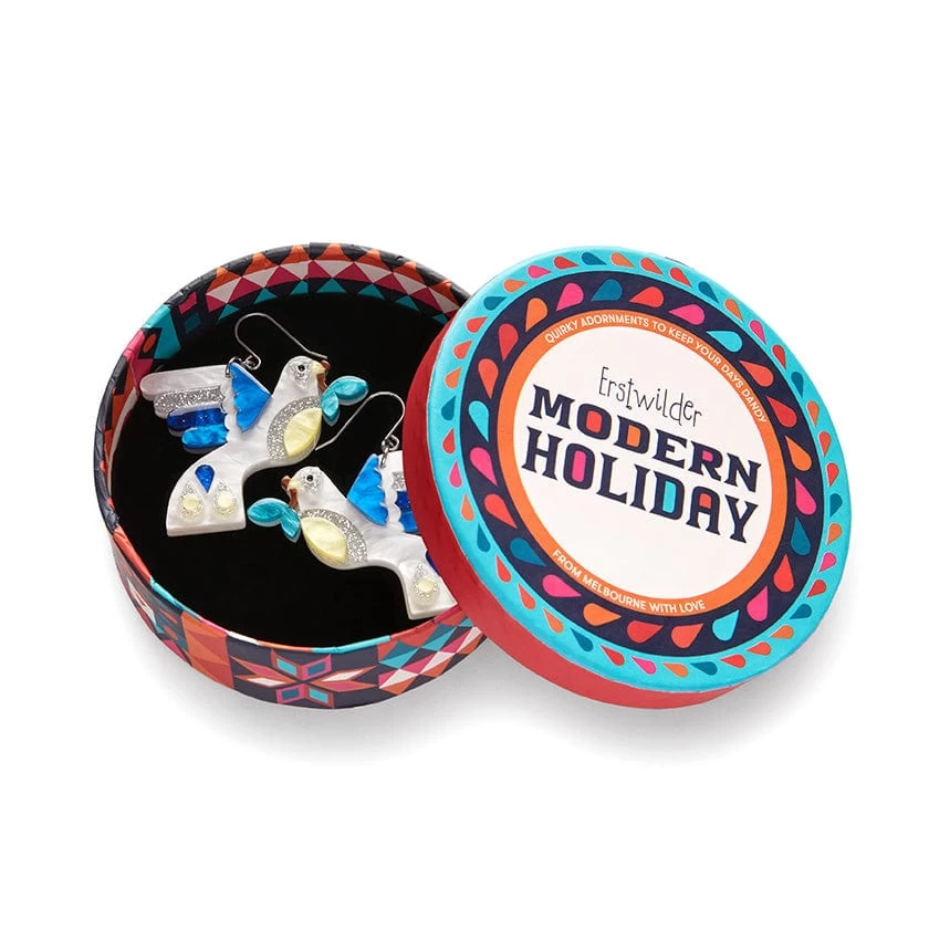 A symbol of peace and of love, we introduce our snow white doves. Hand-assembled from a mix of colourful textured resins with inset pieces and hand painted detailing, these mid-century inspired dove earrings from the Modern Holiday accessories collection will compliment any outfit, festive or otherwise. Love this design? You’ll also discover it available as a resin brooch, statement resin necklace, an enamel pin, and an enamel tree ornament.