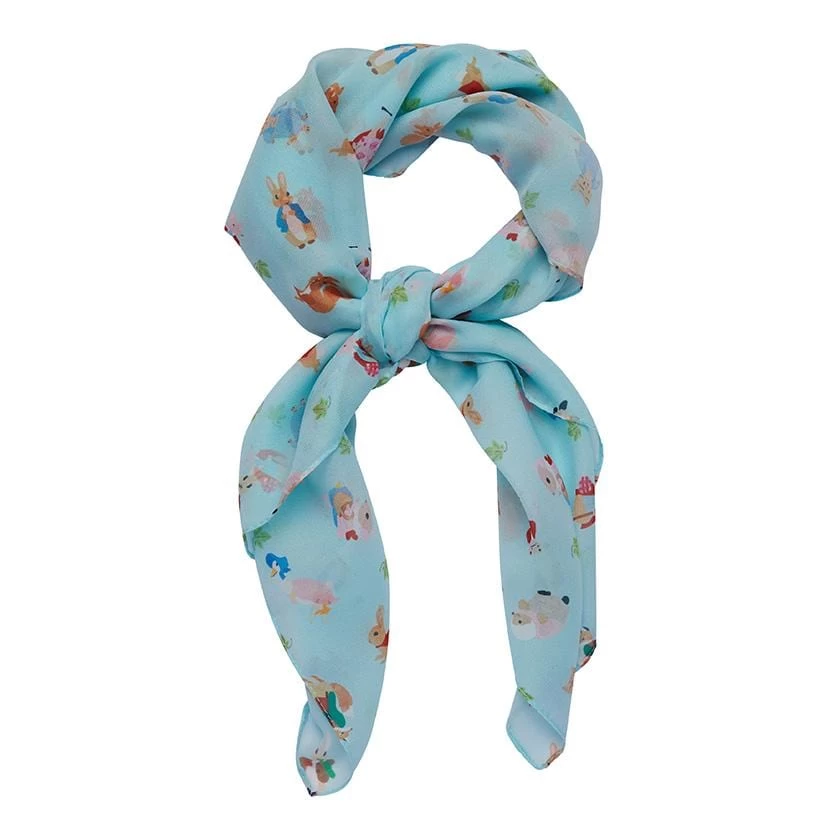 This lightweight headscarf, or kerchief, features a repeat pattern of our Peter Rabbit design, along with his friend and additional leaf accents. Made from 100% Polyester, with a velvet chiffon feel, it’s the perfect accessory for all you bouncing bunnies.