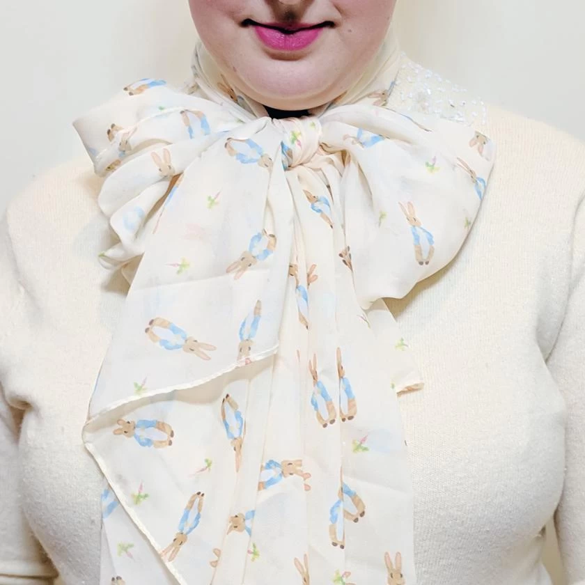 This lightweight neck scarf features a repeat pattern of our original Peter Rabbit design with additional radish accents. Made from 100% Polyester, with a velvet chiffon feel, it’s the perfect accessory for all you bouncing bunnies.