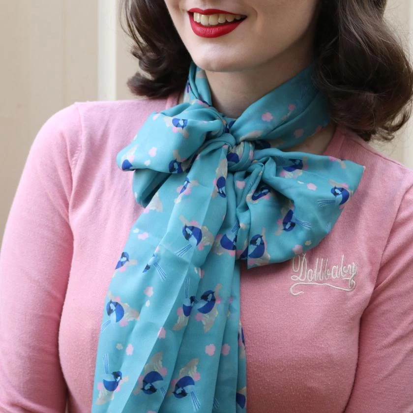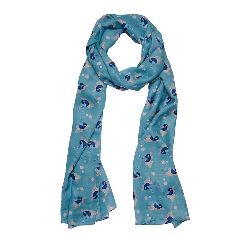 This large neck scarf features a repeat pattern of our original Phoebe the Fairy Wren design with additional blossom accents. Made from 100% Polyester, with a velvet chiffon feel, it’s sure to set your heart a flutter.