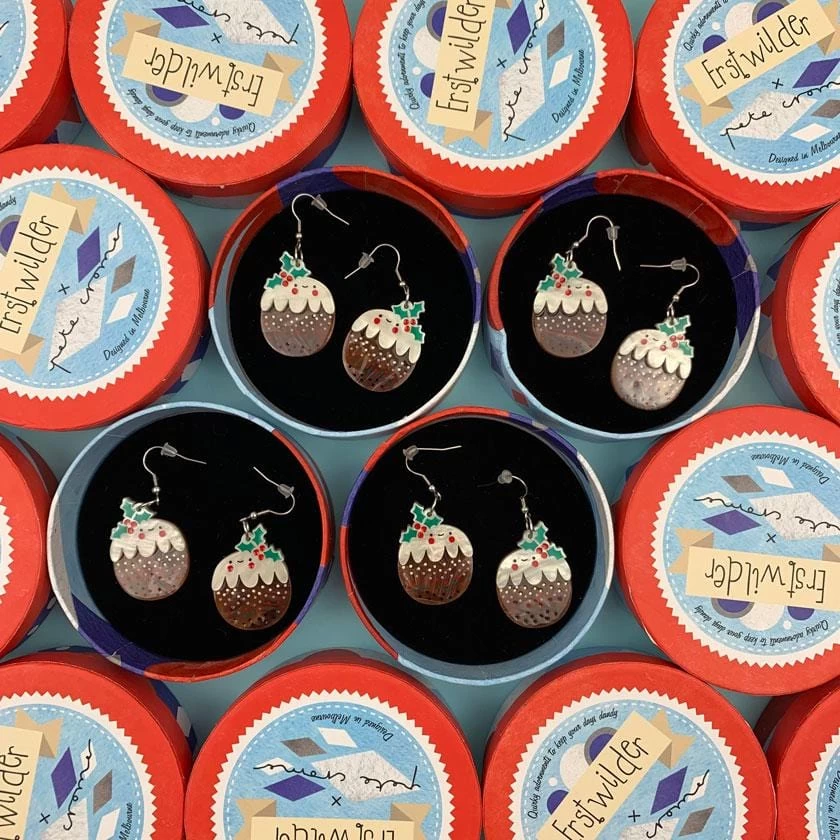 Our very special collaboration with iconic artist Pete Cromer brings an Aussie twist to the Christmas classics! A treat as beautiful as it is tasty (do not eat your earrings), featuring gorgeous hand-assembled and hand-painted details on a backdrop of dreamy textured resins to make the perfect holiday dessert!Â
