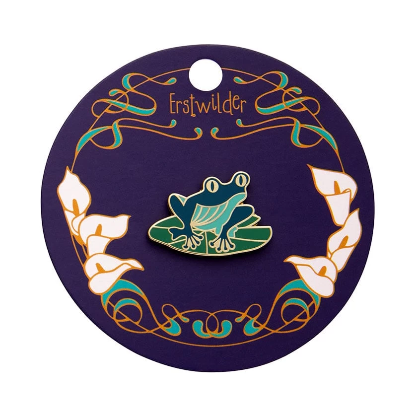 A potential prince or princess in disguise? This lovely, limited-run hard enamel frog pin is part of the La Belle Époque collection. As at home on your outfit as a frog on a lily, it is also available as a layered resin brooch.