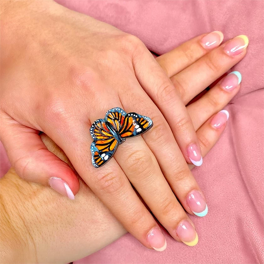 A butterfly flaps its resin wings and just like that, your outfit is complete. Hand-assembled from solid and textured resins, and featuring hand-painted details, pairing this beautiful statement ring with our Prince of Orange hair clips, brooch or earrings will have you feeling like royalty.