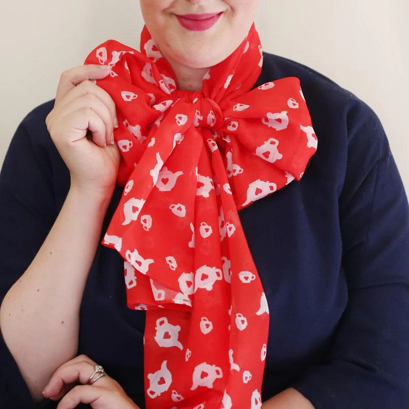 This lightweight neck scarf, features a repeat pattern of our original Rosy Lee design with additional teacup accents. Made from 100% Polyester, who doesn’t love a spot of tea?
