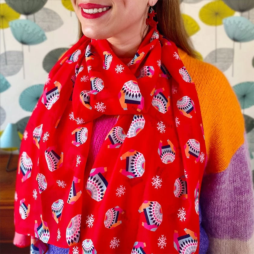 If they call them ‘ugly sweaters’ give us an ‘ugly scarf’ to match, we say! Featuring concept art of both the Seasonal Sweater and Snowflake designs from the Modern Holiday collection, this lightweight oblong neck scarf features an all-over repeat pattern. Made from 100% Polyester, with a velvet chiffon feel, it makes for the perfect finish for your festive ensembles.