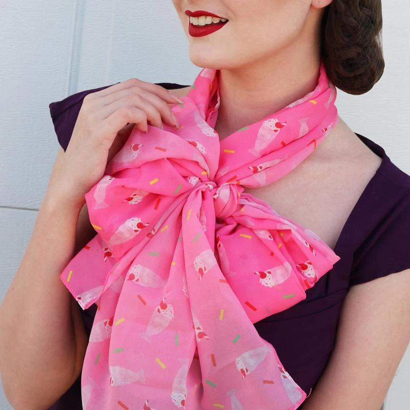 This lightweight neck scarf features a repeat pattern of our original Shake, Rattle and Roll design with additional sprinkle accents. Made from 100% Polyester, with a velvet chiffon feel, it’s as sugary sweet as you are.