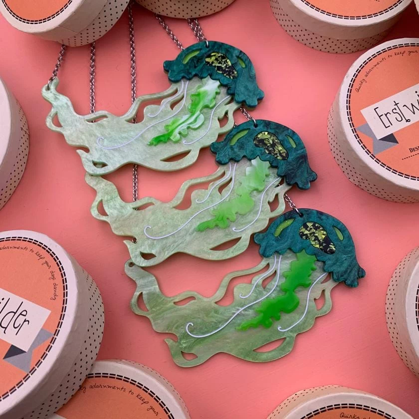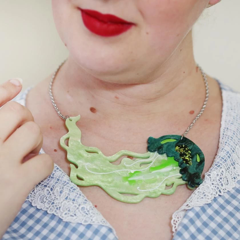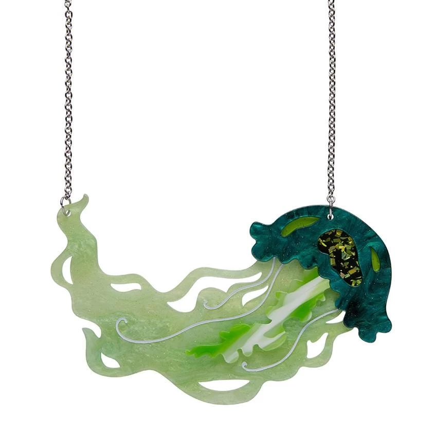 Please note each piece may differ from one to another, and the ‘Slippin’ Under’ necklace, might differ from the one pictured. The ‘Slippin’ Under’ necklace uses a marble textured resin in the centre which can range from light green, to white, to a mixture of the two. It also features a textured resin at the head of the jellyfish which can be a swirling emerald green, or the green with cloudy black markings. Like real creatures in nature, the markings are unique to each necklace.Â
