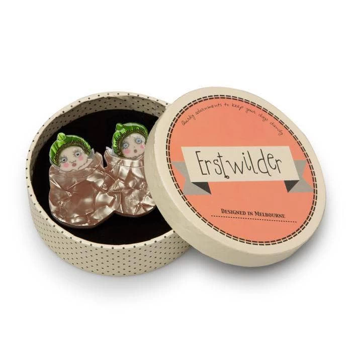 Inspired by and paying homage to the wonderful world and utterly delightful creations of May Gibbs, this classic Snugglepot & Cuddlepie brooch, at home among the leaves of the very tallest gum tree has been created from a combination of textured and solid resins with hand-painted details.