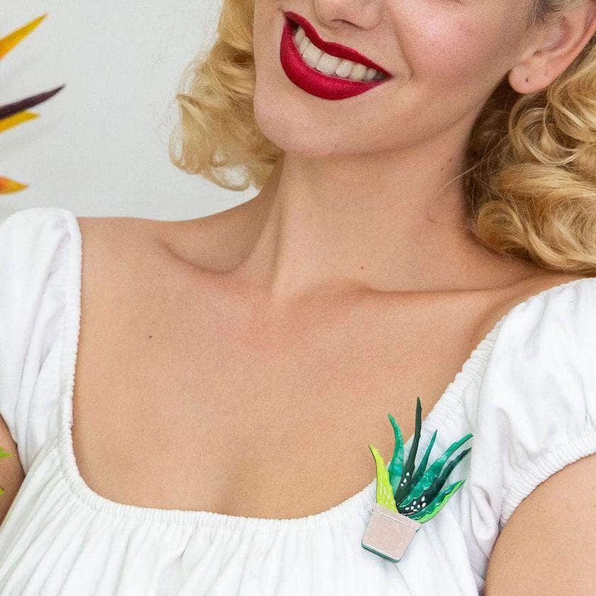 Often associated with dietary and medicinal uses, our Allow Vera houseplant brooch, hand-assembled from glitter and textured resins, features hand-painted details and is strictly decorative, we’re afraid.