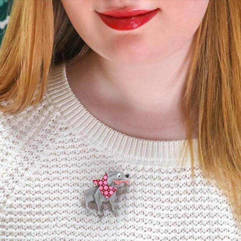 Staffy Stan returns once again with all of his personality, and a fancy new printed scarf, but this time shrunken down to Erstwilder ‘mini’ brooch size. A perfect pooch to complete any outfit, Staffy can’t wait to meet you! Shop this delightful dog brooch for yourself or make it a meaningful gift for any Staffy lover in your world. Available strictly while stocks last.