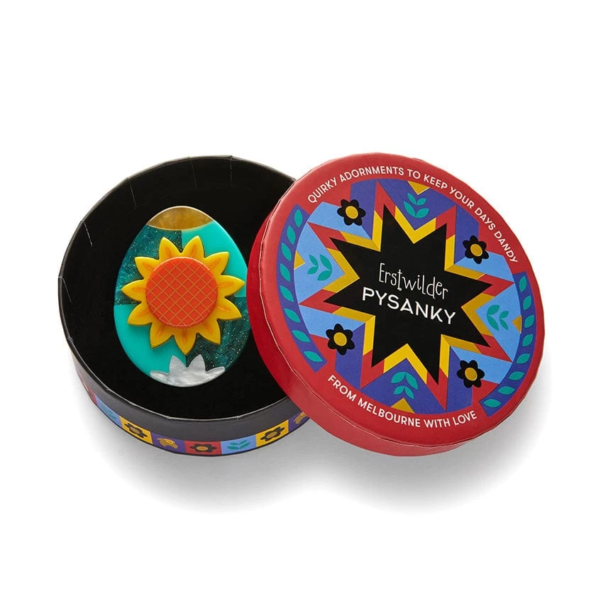 A Pysanka egg representing the love of life and whomever is responsible for its creation, this Sunflower of Love brooch has been hand-assembled utilising the colours orange and yellow, signifying the everlasting sun and the light it provides, as well as shades of green, the colour of bountifulness. This egg is an appropriate gift for a spiritual person in your life.