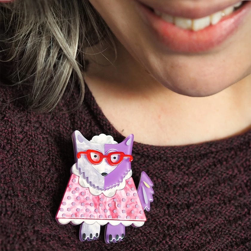 Part of our fairy tale collaboration with beloved Australian artist Pete Cromer, this Big Bad Wolf (in Grandma’s clothing!) wearable art brooch has been lovingly hand-assembled and features a combination of hand-painted and printed detailing. Inspired by one of the world’s best-loved stories (Little Red Riding Hood), this design is also available as a hard enamel pin.