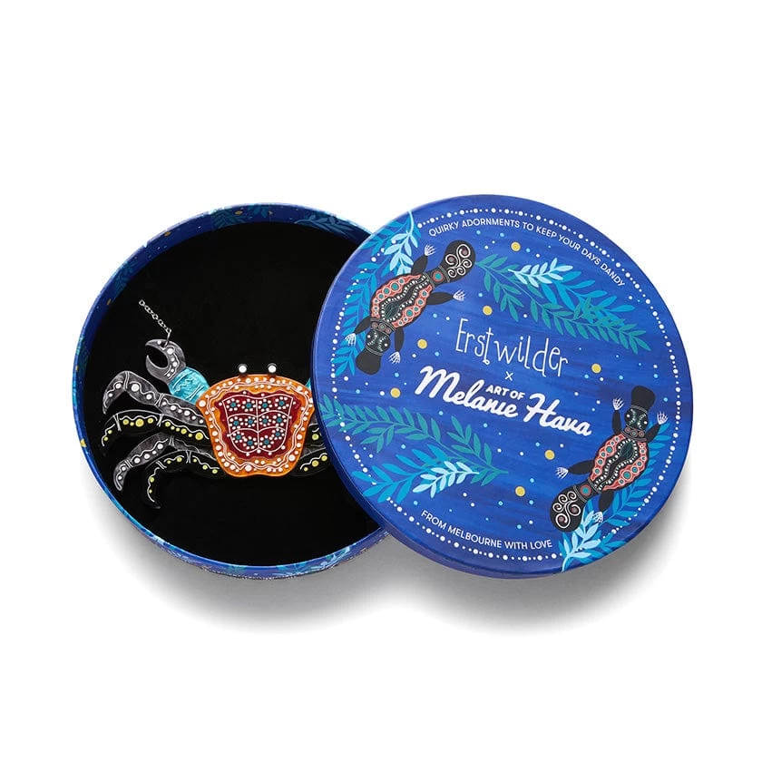 This darling Crustacean creation is so stunning, you may just have to pinch yourself to believe it’s real. Our Crab ‘Gadambal’ Necklace is sure to scuttle its way onto your decellotage and into your heart. This unique and detailed design is a part of our long-awaited collaboration with Aboriginal Artist Melanie Hava. Featuring layered resin with hand-finished details, Melanie’s incredible art has been taken off canvas and brought to life as wearable art.
