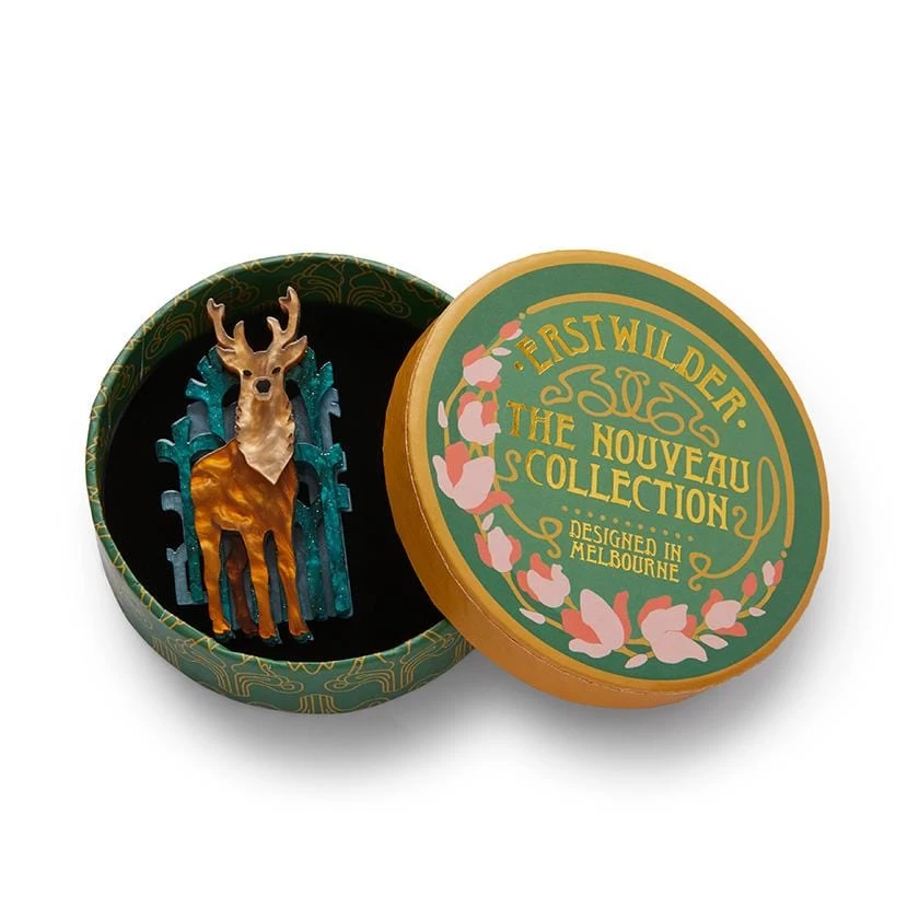 A bounding beast with some serious horns! Featuring a collection of textured and glitter resins this beauty also features hand-painted and hand-assembled details. Enter the forest and walk within nature, Art Nouveau inspiration inspires us as we hope it inspires you.Â