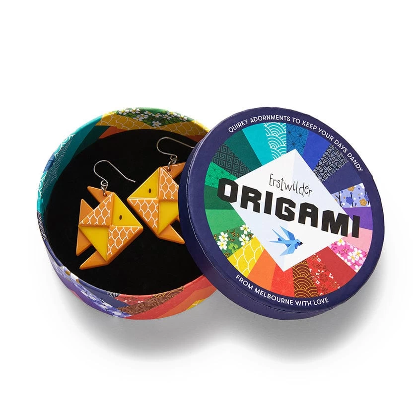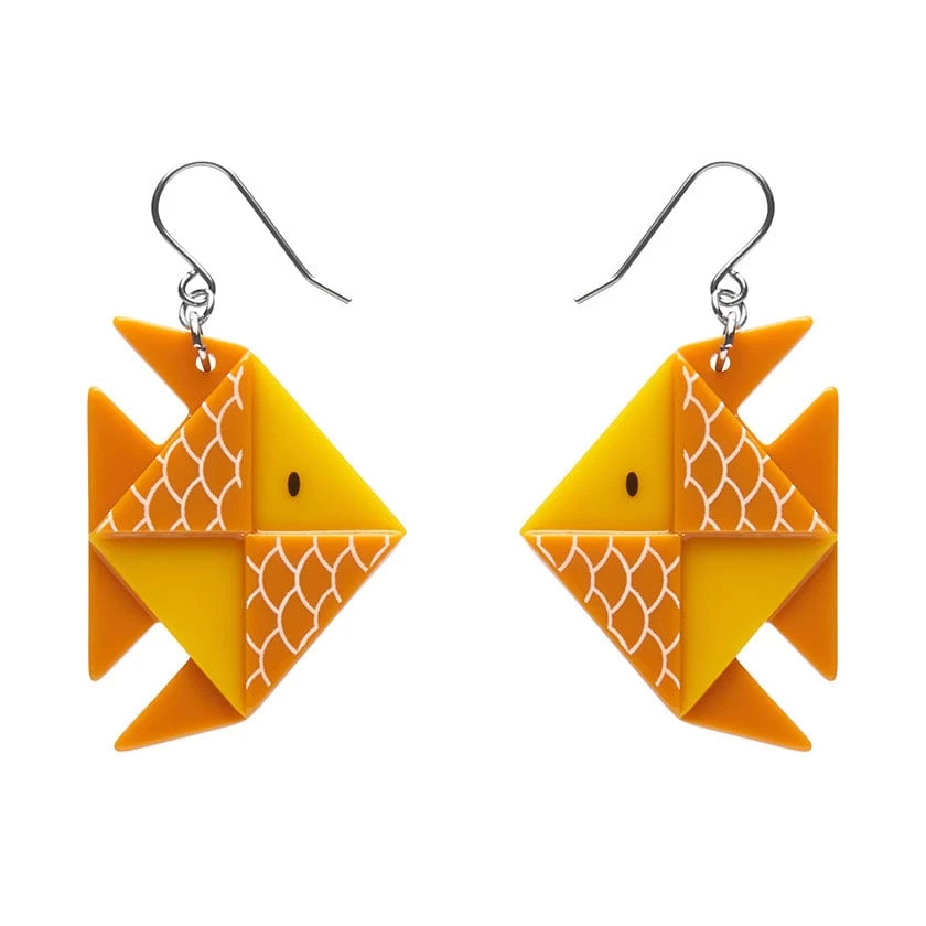 Hand-assembled from a combination of printed and solid resins, these limited-run The Memorable Goldfish earrings are accessories not so easily forgotten. With the expertly-layered resin perfectly emulating the folds of origami paper, you can put memory-related myths to bed by pairing these fish drop earrings with our Forget-Me-Not elephant brooch, or their matching brooch and hair clips.