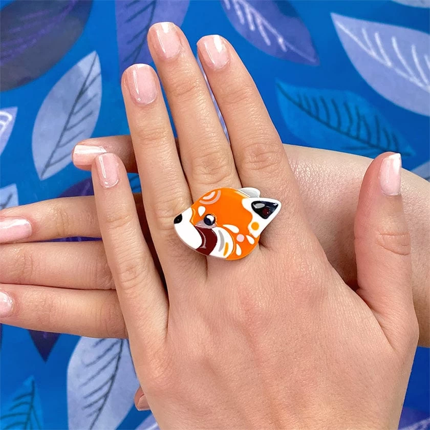 A beautifully wild collaboration with beloved Australian artist Pete Cromer, this Rakish Red Panda Ring is dazzling in a combination of marbled and textured resins. Lovingly designed, hand-assembled and hand-painted, each ring is available in sizes Small, Medium and Large with open ring bands for small adjustments. Wear with the Rakish Red Panda brooch or by itself for style that is truly wild at heart.