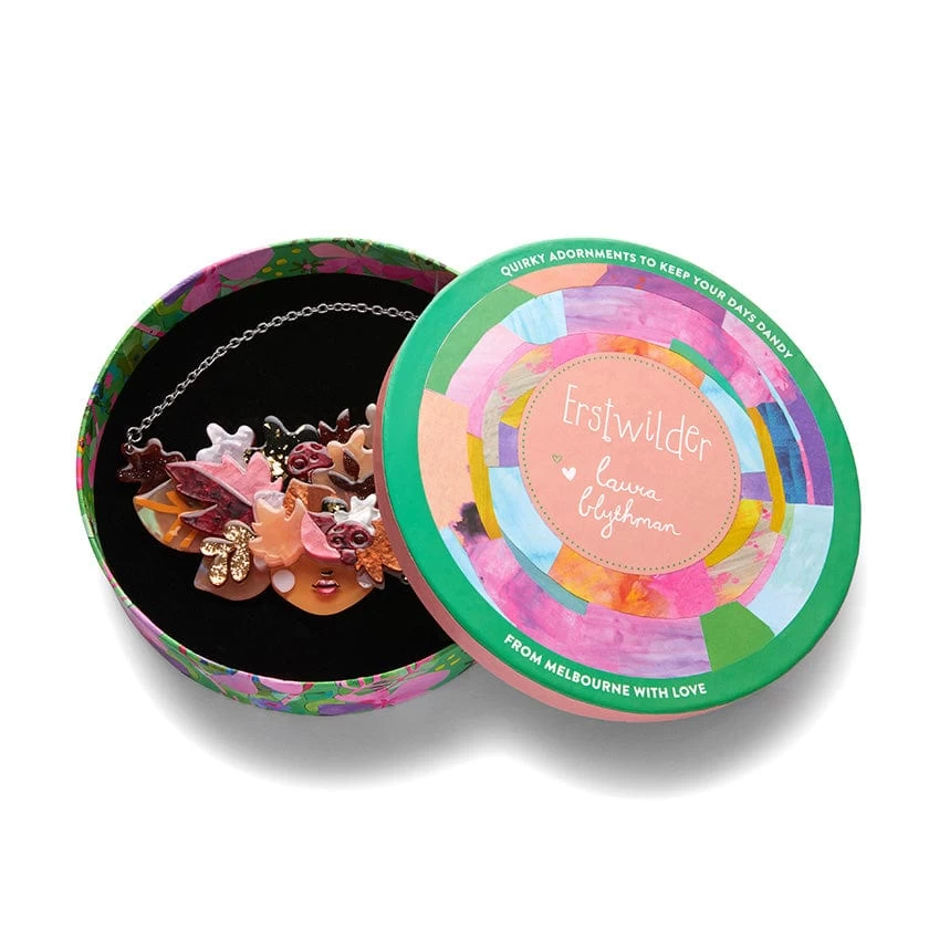A fiery foliage necklace that evokes the essence of harvest, this cosy Laura Blythman design has been hand assembled from a colourful selection of premium resins. With hand-painted details eliciting an aura of warmth, wear this one with it’s matching Turn a New Leaf brooch to complete your Fall fashion look.