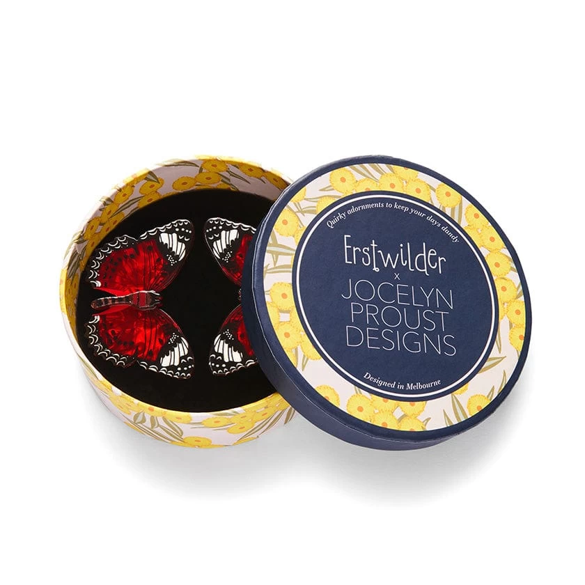 Hand-assembled from a selection of vibrant resins and featuring a combination of printed and painted details, these Red Lacewing Butterfly hair clips are part of the third Erstwilder x Jocelyn Proust Designs collaboration. A fitting addition to your favourite fashions, Wings Laced in Red can be worn alongside their matching brooch, earrings or hard enamel pin.